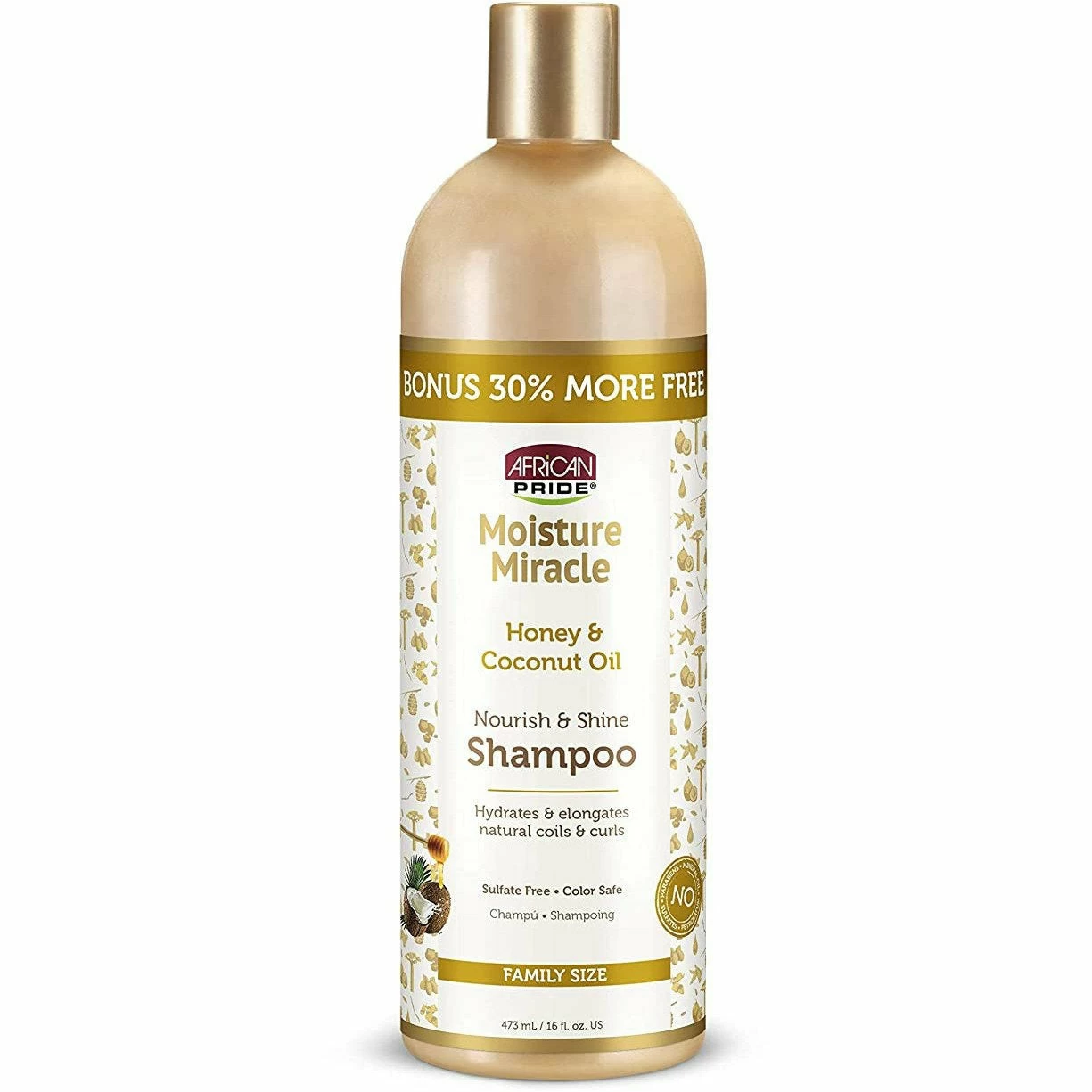 African Pride: Honey & Coconut Oil- Nourish & Shine Shampoo This gentle cleansing formula removes dirt and buildup from hair without stripping hair of its natural oils; using a blend of Honey & Coconut Oil to deeply penetrate and hydrate natural coils and curls, leaving the hair soft, nourished and with natural shine.