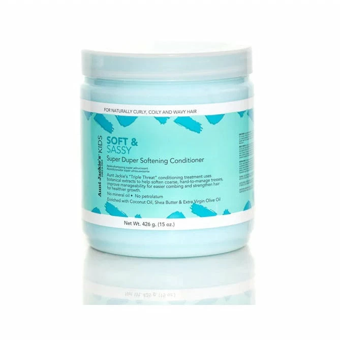 Aunt Jackie’s Girls Soft and Sassy Super Duper Softening Conditioner is a “Triple Threat” conditioning treatment that is enriched with Coconut Oil, Shea Butter & Extra Virgin Olive Oil. Aunt Jackie’s GIRLS Soft & Sassy is a multiple-use conditioner that can be used as a co-wash, deep conditioning treatment or a rinse out conditioner. It works quickly to help soften and loosen tight coarse textures.