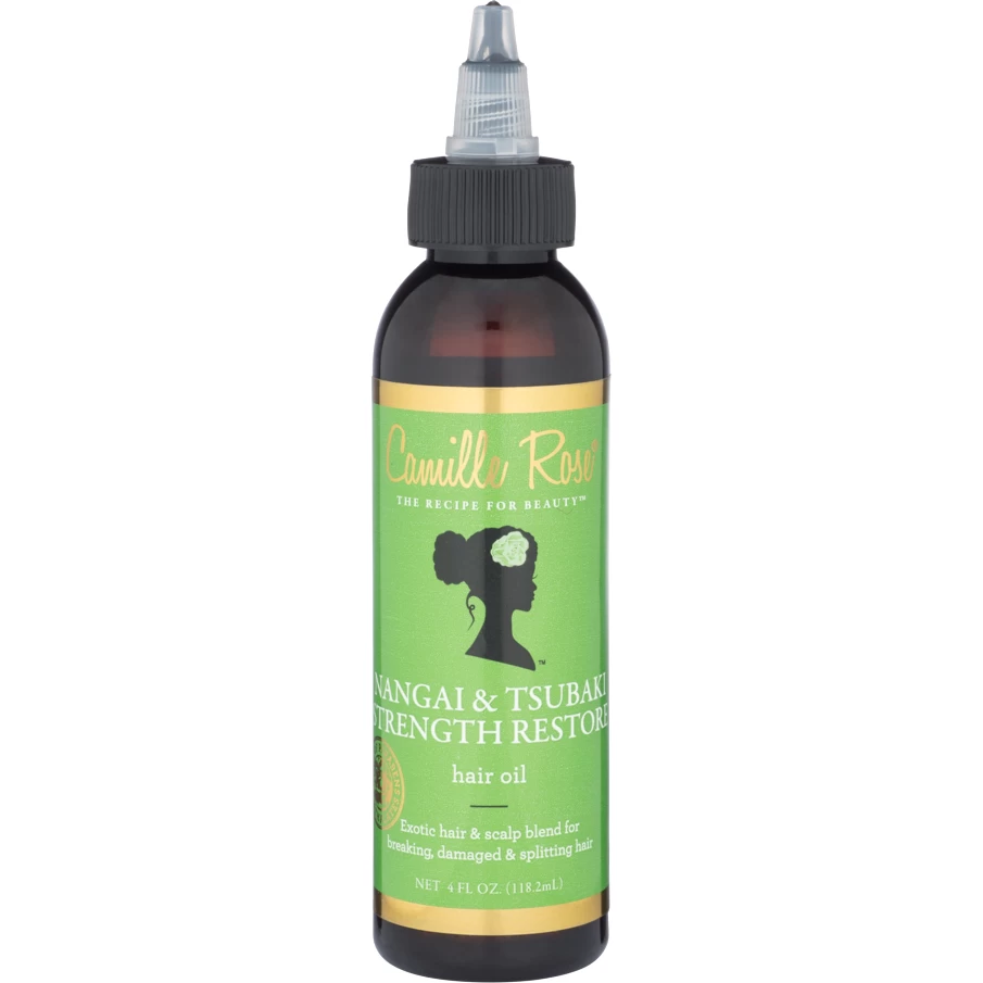 Camille Rose Nangai & Tsubaki Strength Restore Hair Oil strength restoring cocktail infuses Nangai nut oil with Japanese Tsubaki oil rich in Vitamin E and Omega 3, crafted to prevent breakage, retain moisture, and promote healthy and stronger hair.