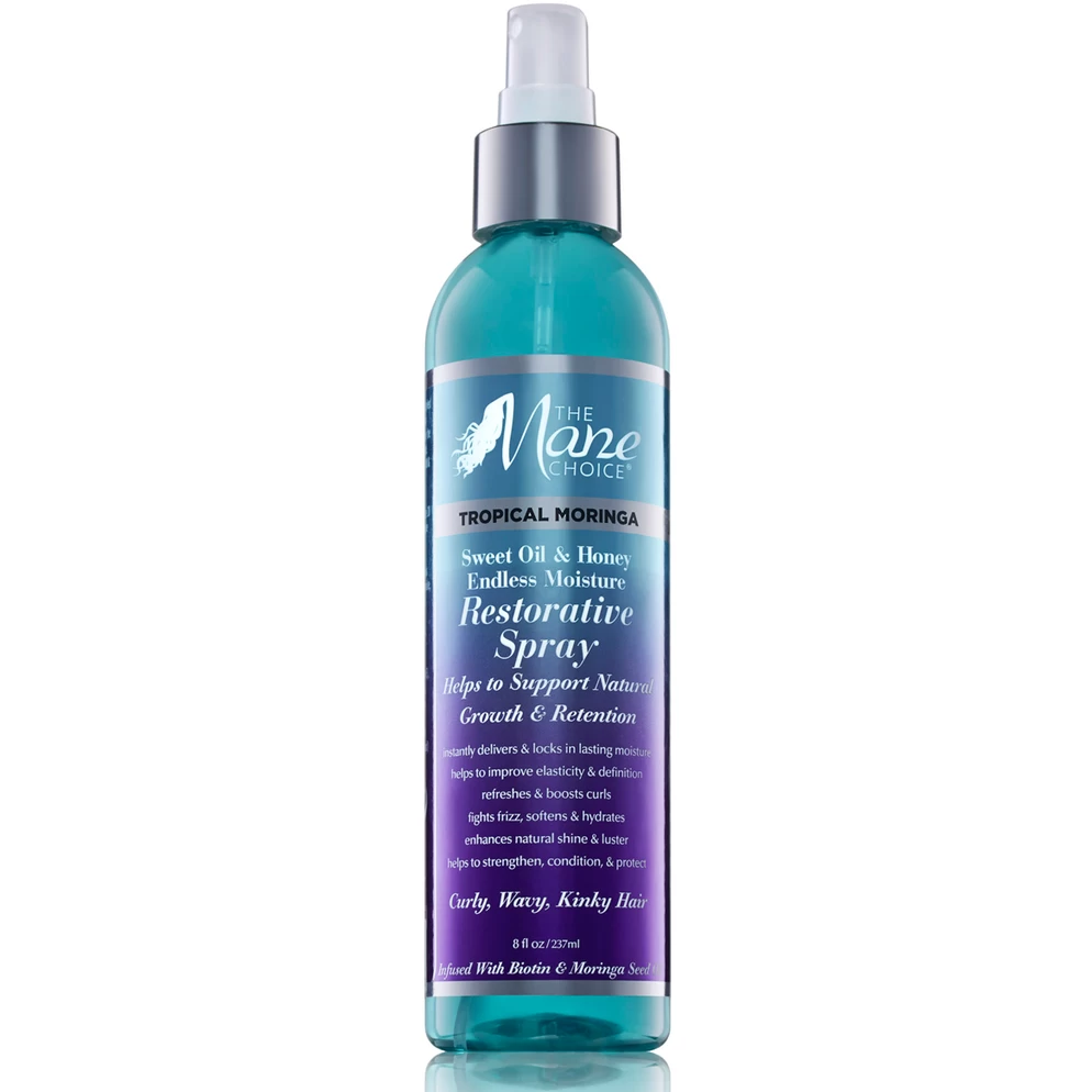 The Mane Choice Tropical Moringa Sweet Oil & Honey Endless Moisture Restorative Spray is a major key to maximizing moisture retention. The advanced moisturizing blend is infused with essential vitamins and Moringa Oleifera Seed Oil, which is derived from The Moringa Tree, also known as the “healing” tree, that deeply penetrate the hair shaft to infuse it with vital moisture and nutrients. Power packed to improve shine, strength, and manageability.