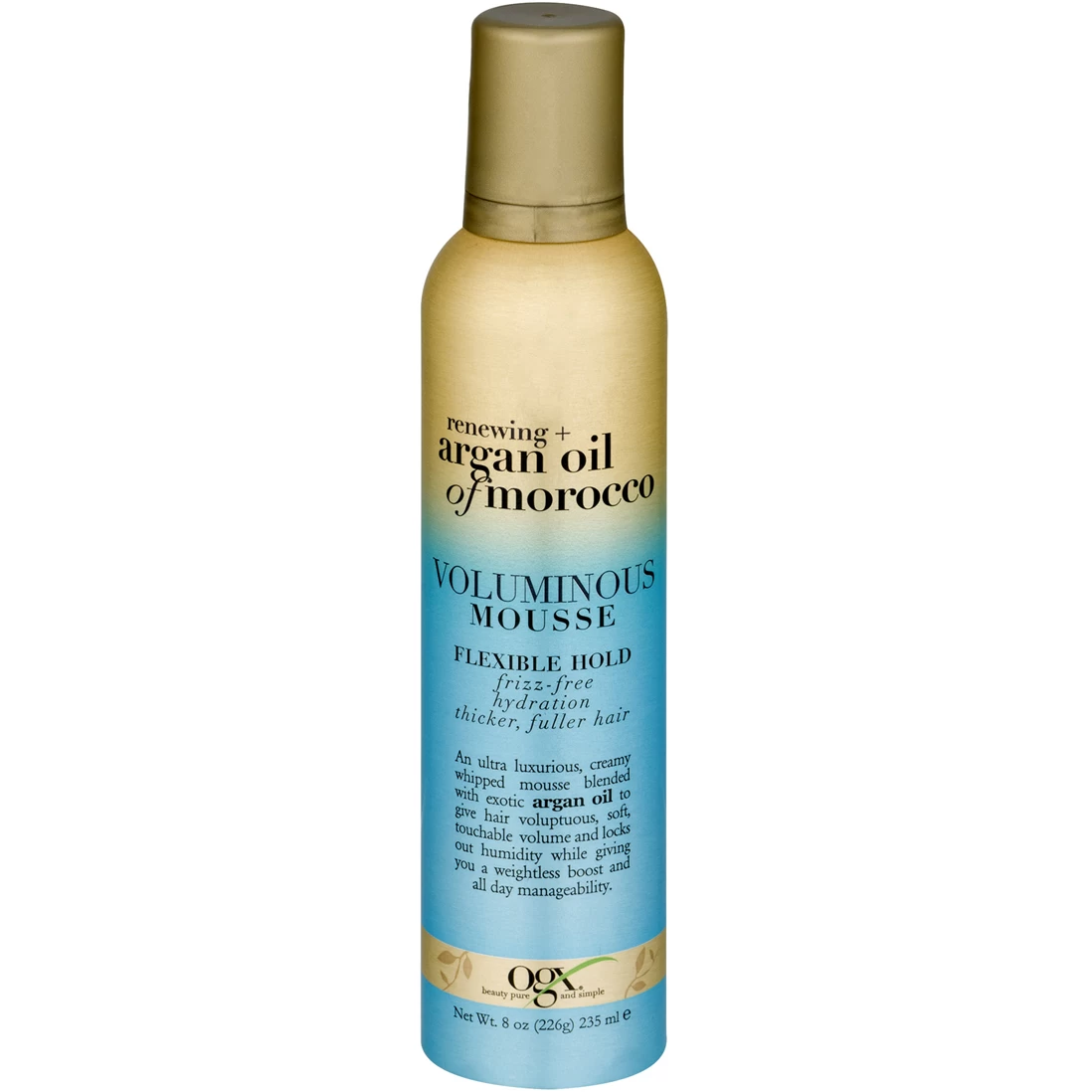 OGX Argan Oil of Morocco Voluminous Mousse helps give your hair more body and build without weighing it down, & it’s flexible hold will help keep your hair soft, brushable & manageable all day long. This hair mousse helps gives your hair volume & shine.Â