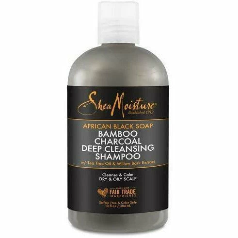 Shea Moisture’s African Black Soap Bamboo Charcoal Deep Cleansing Shampoo gently cleanses while removing buildup from styling products.