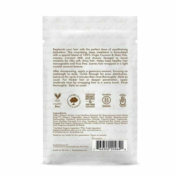 Replenish your hair with the perfect dose of conditioning hydration. This nourishing deep treatment is formulated with a special blend of 100% Virgin Coconut & Shea Oils, creamy Coconut Milk and Acacia Senegal to boost moisture for silky soft, shiny hair. Helps keep healthy hair manageable and frizz free. Leaves hair wrapped in a light coastal coconut breeze.