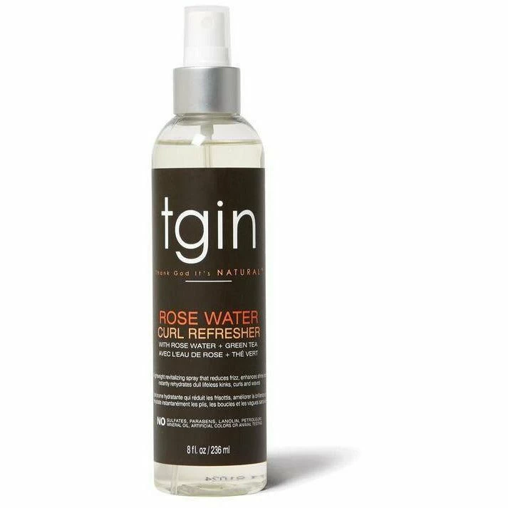 tgin Rose Water Curl Refresher is the perfect pick me up for even the most dull lifeless curls. This special formula is enriched with rose water and coconut oil to hydrate, smooth and refresh overworked kinks, curls, and waves.
